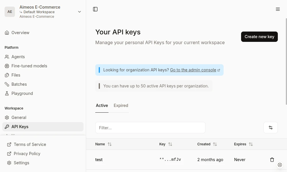 - Navigate to API keys: In the left sidebar or top navigation, look for a section like "API Keys" or "Settings" then "API Keys".