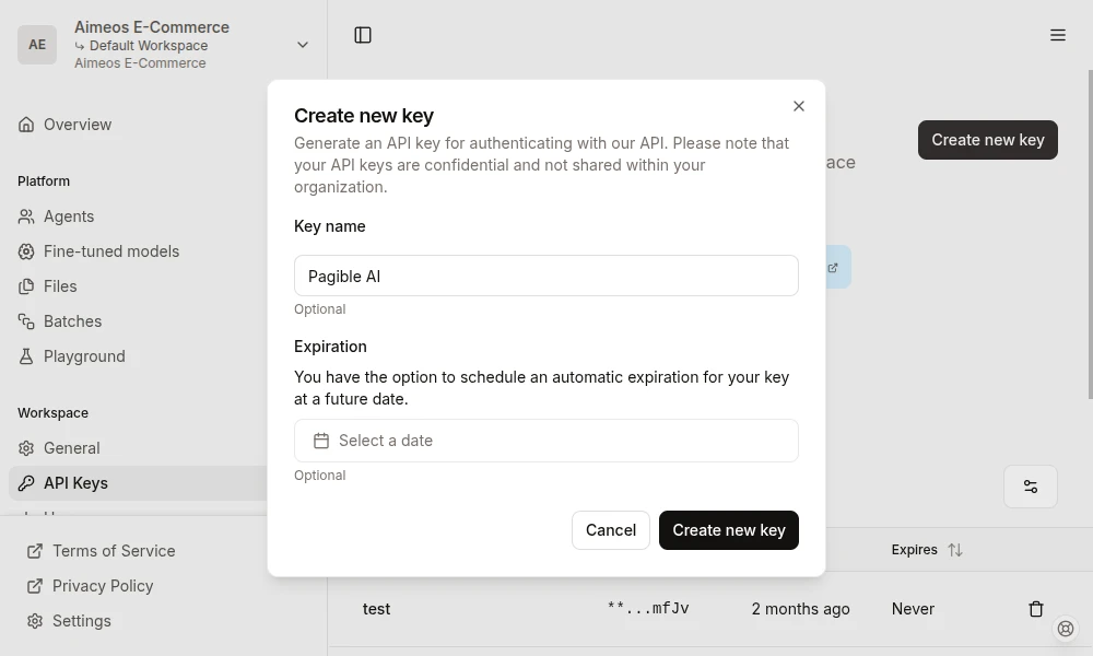 - Name your key (Optional): You can provide a name for your key to help you organize them (e.g., "PagibleAI Integration").